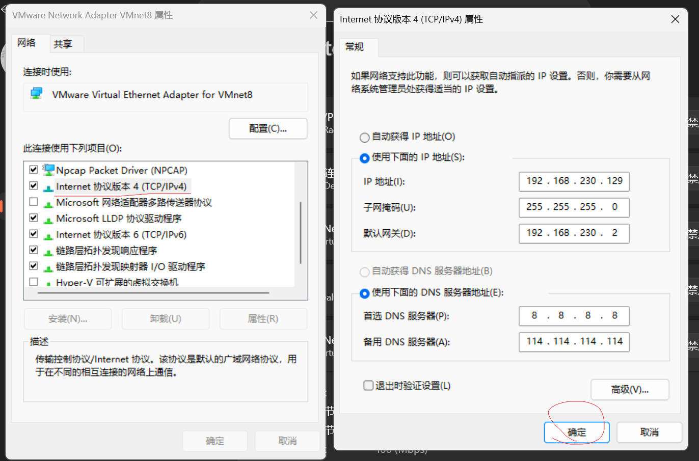 2.配置本主机Windows的IP(192.168.230.129)、子网掩码(255.255.255.0)、网关(192.168.230.2)和 DNS服务(8.8.8.8、144.144.144.144)