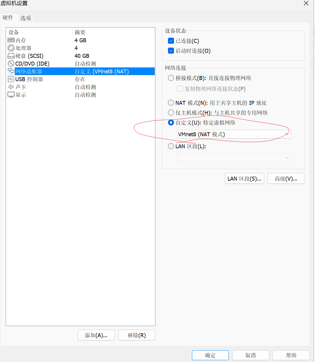 4.设置对应虚拟机,将网络连接模式改成VMnet8(NAT模式)
