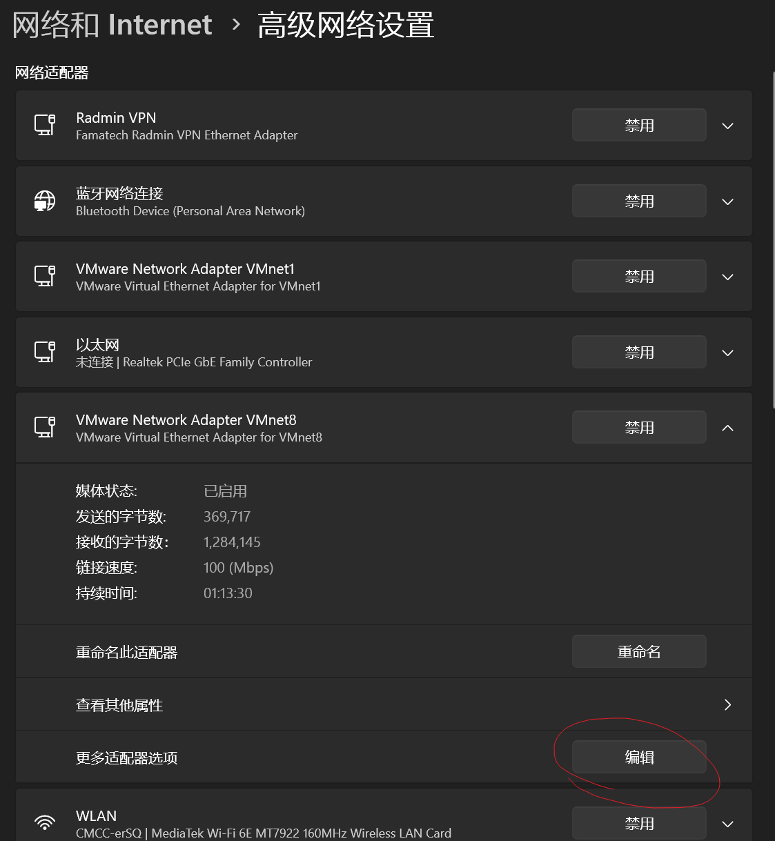3.打开 VMware 编辑 - 虚拟网络编辑器 ,更改如下配置
